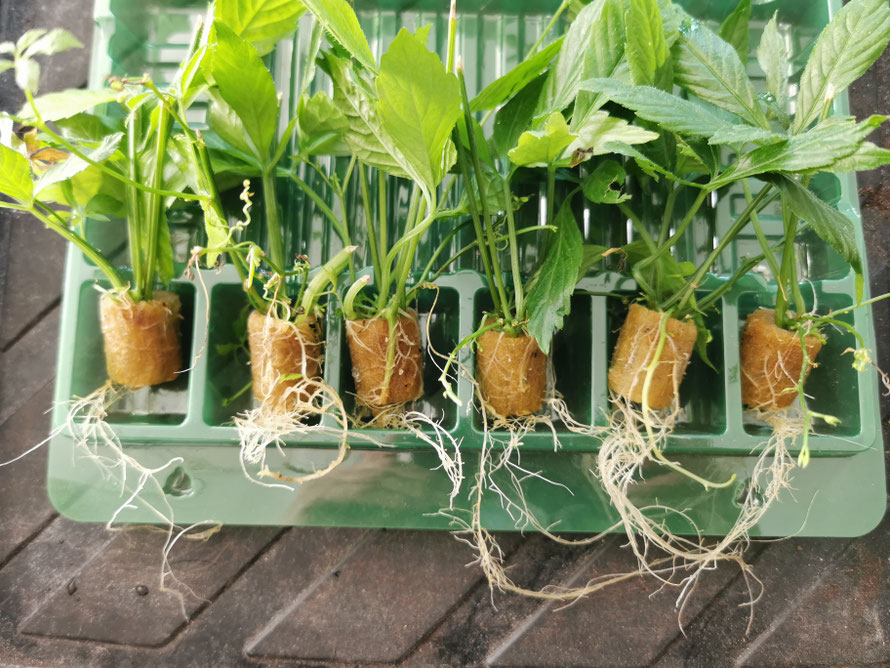 Vom bewurzelten Steckling (ganz links) bis zur Pracht-Jiaogulan "Grüner Riese" ist es ein langer, oft zeitraubender Weg. Sorgfältiges Entwirren der langen Triebe, deren ordnende "Stäbung" und eine mehrfache Umtopfung unterscheidet uns von Großbetrieben. Zeitaufwand ist ein kostbarer Faktor, der im Regelbetrieb kaum zu leisten ist. Unser wichtigstes Ziel ist dabei eine maximale Wirkstofferhaltung.